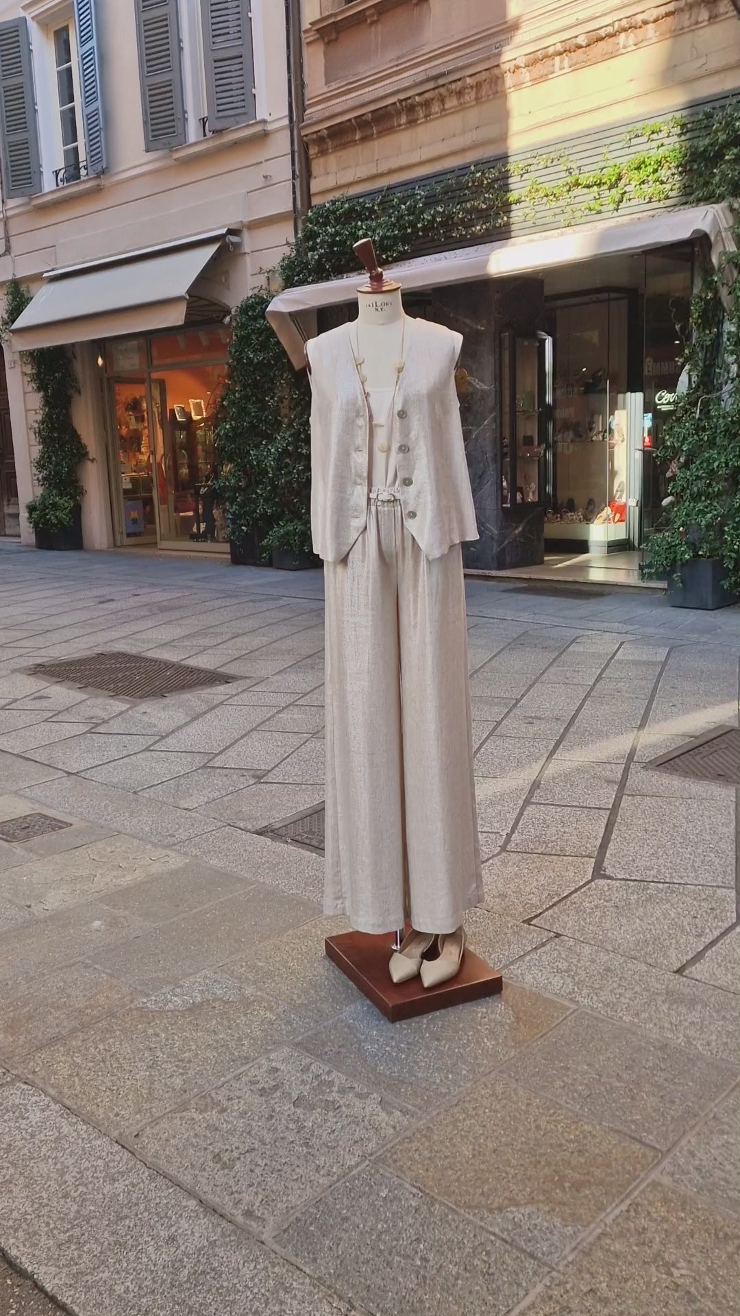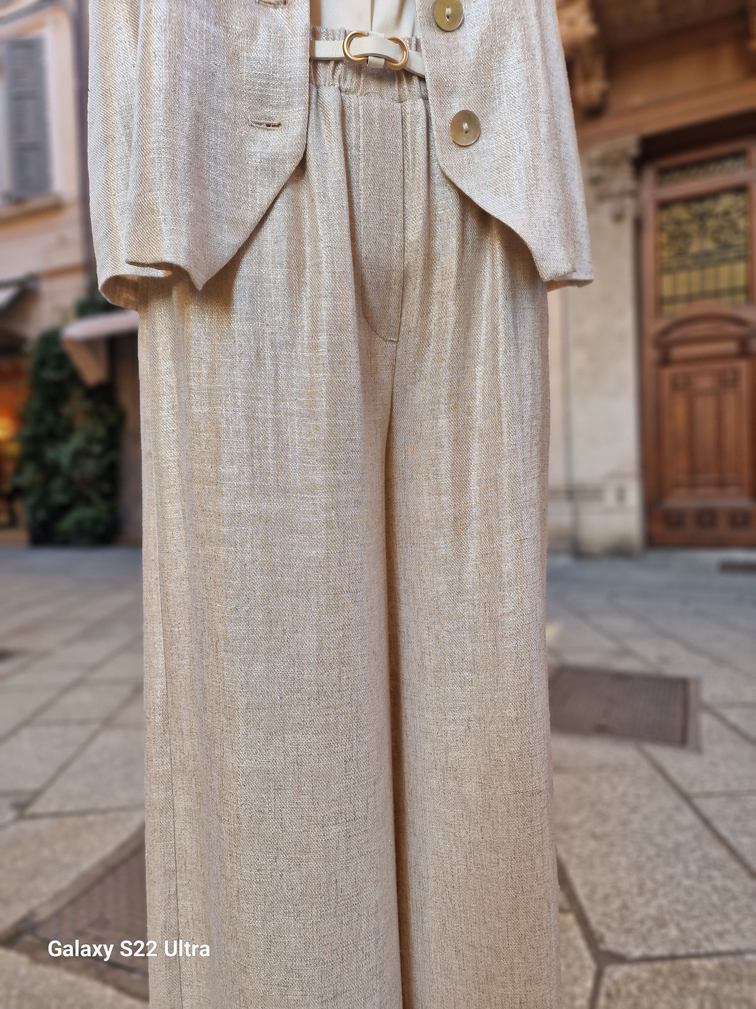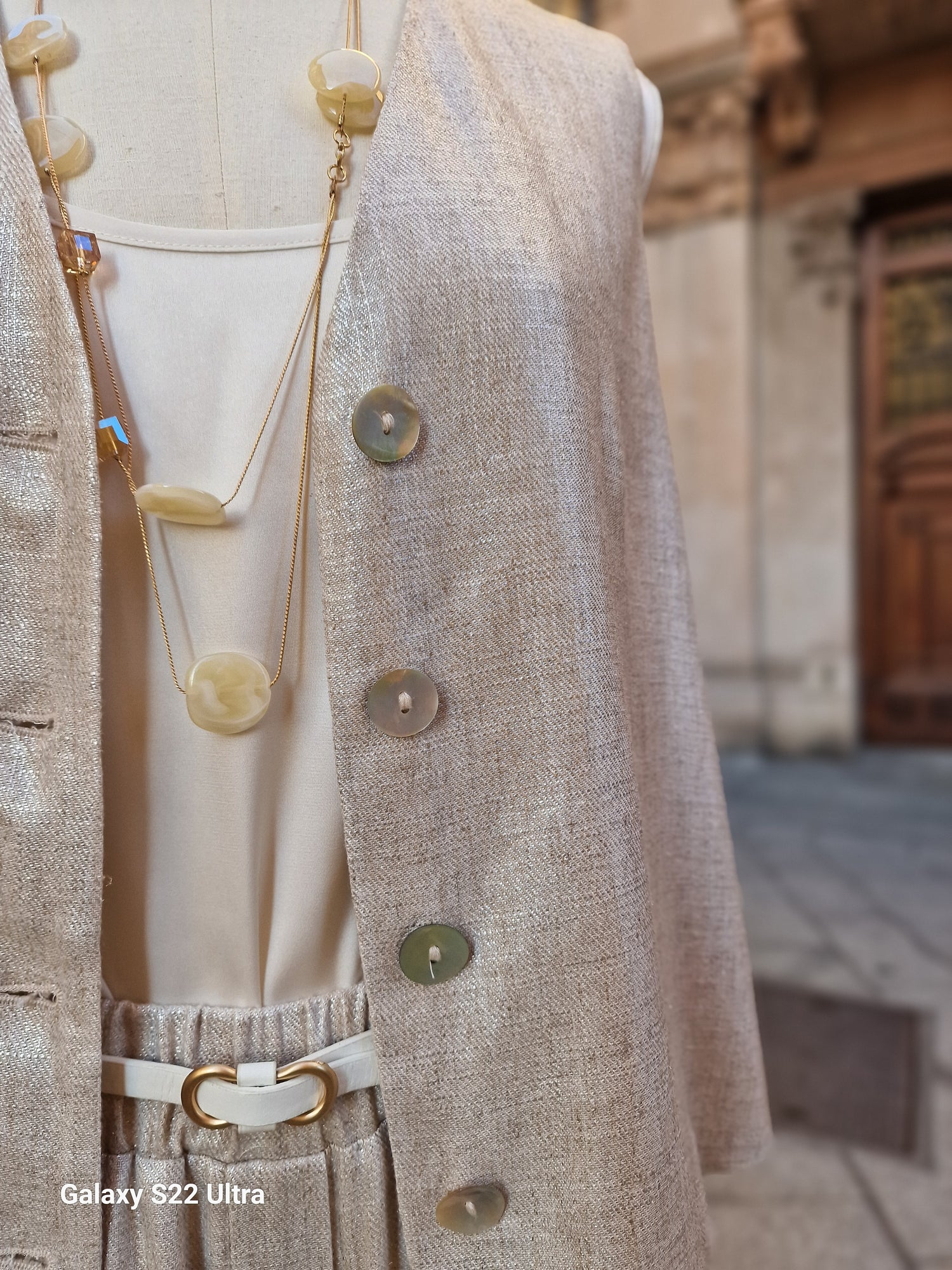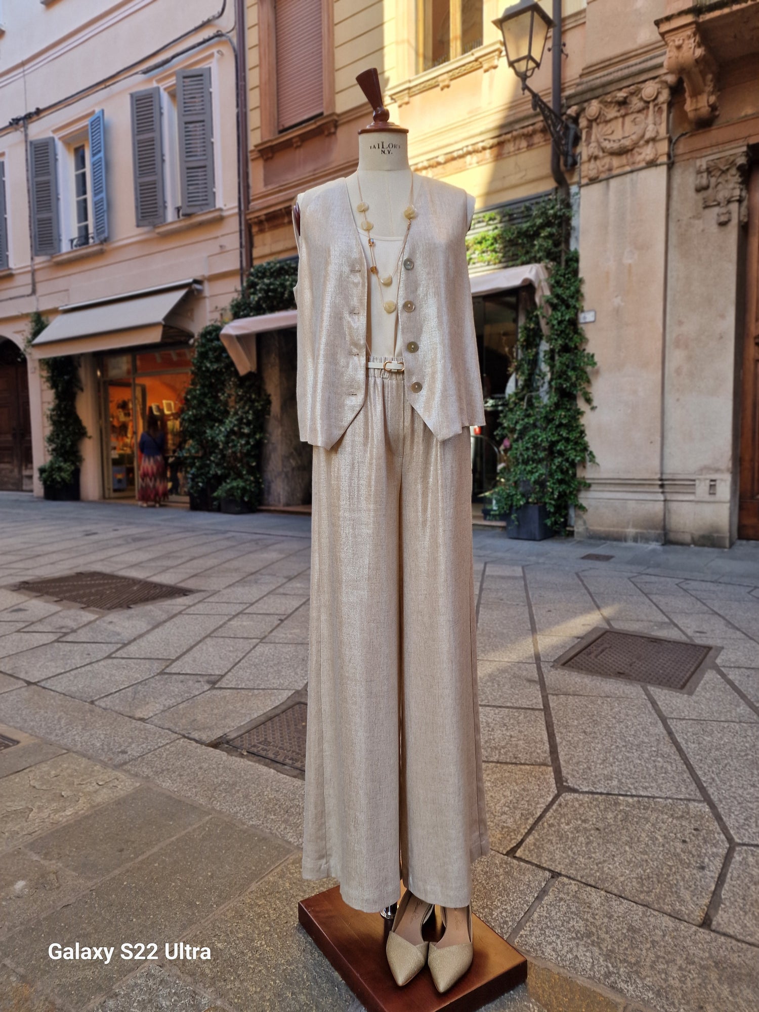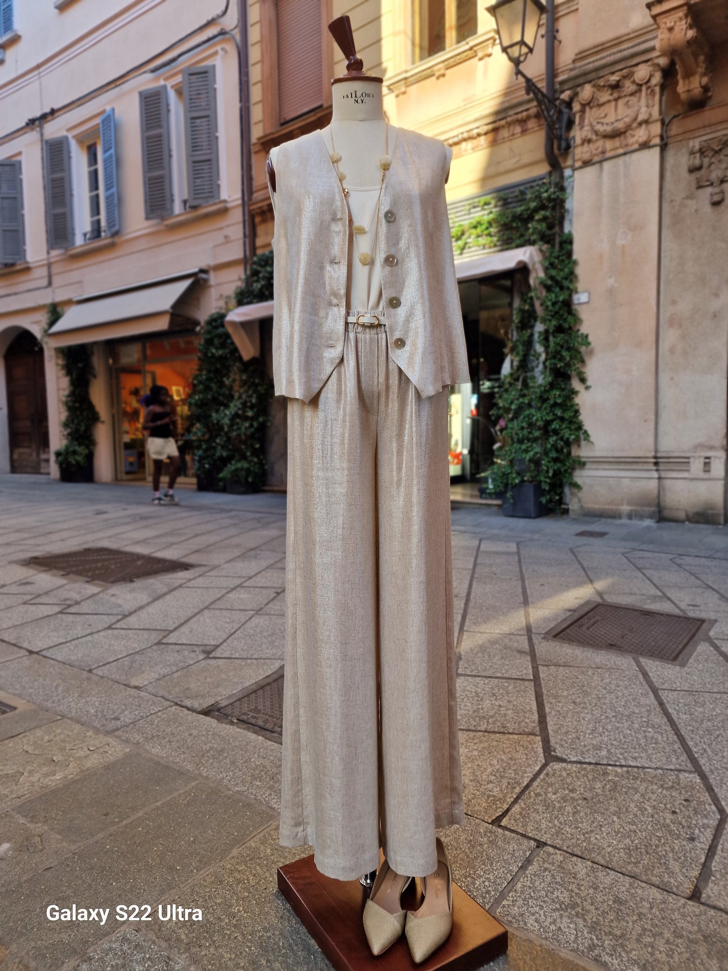 Completo Gilet pantalone ampio, in tessuto morbido e leggerissimo, lino e Viscosa, leggermente gangiante, elegante, adatto per tante occasioni.